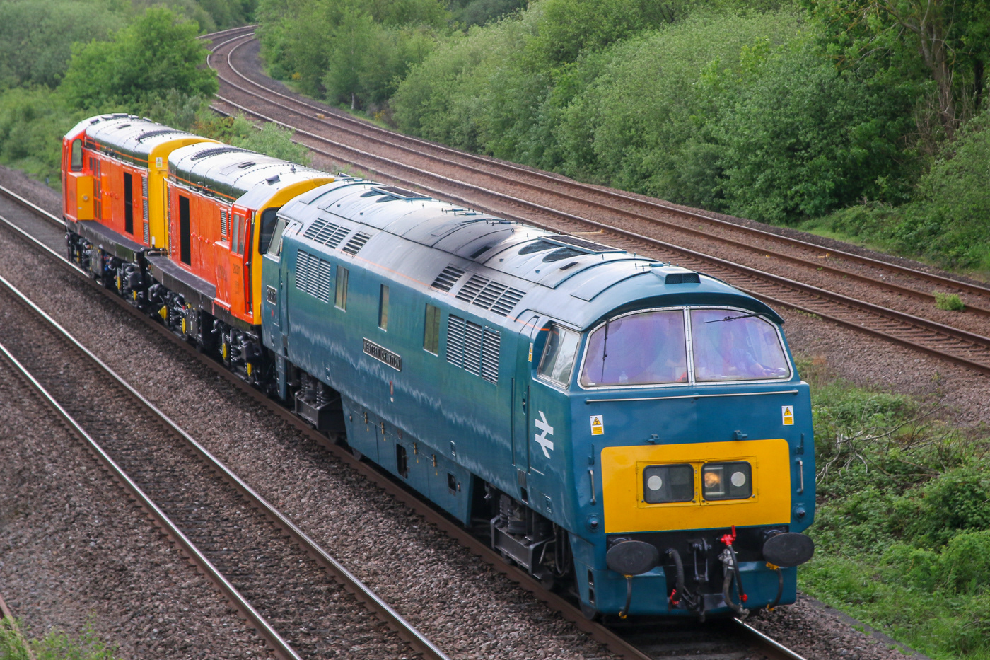 BR Class 52 Western D1015 Western Champion hauling 2 class 20's #20311 and #20302 northbound at East Stafford Junction near Willington Derby. The locomotives are en route to Barrow Hill 14 May 2024